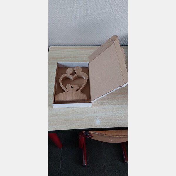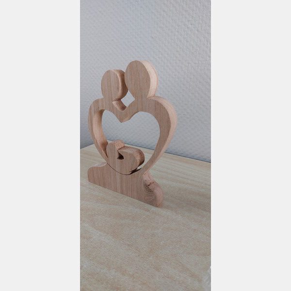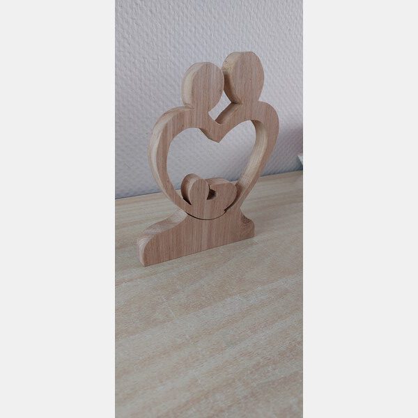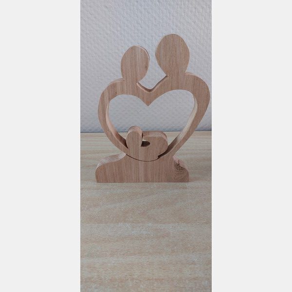 Decoratief beeld van hout waarbij ouders samen een hart vormen om een kind (of kinderen).