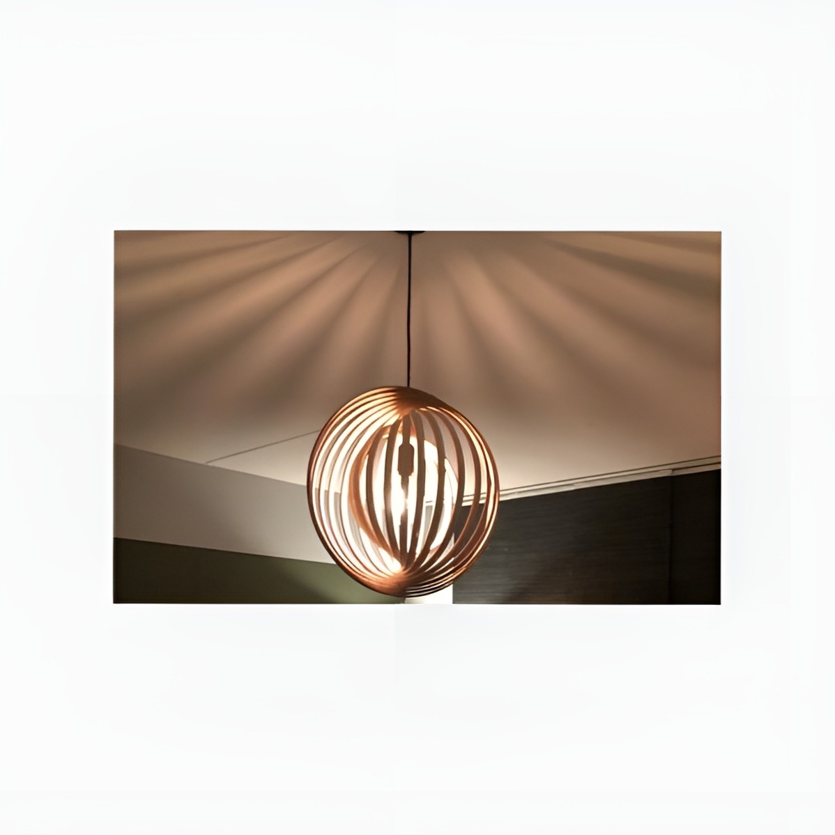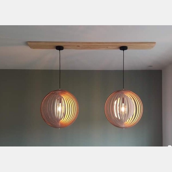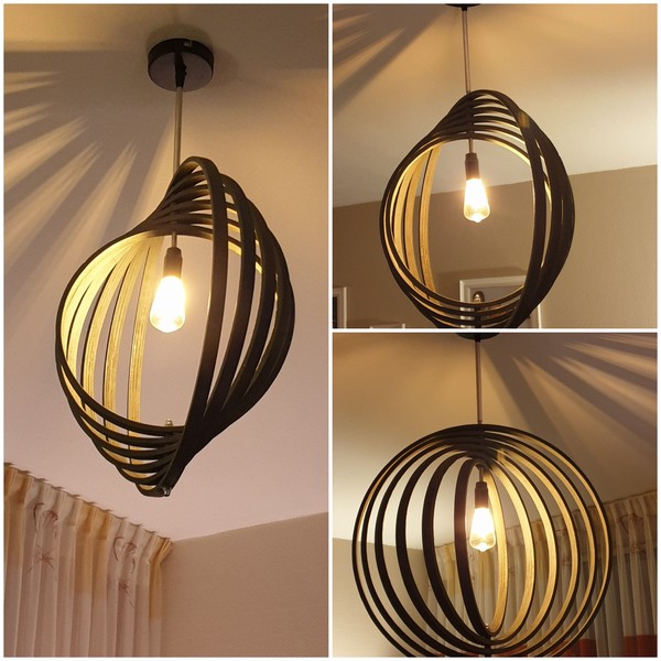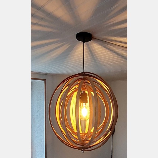 Deze lamp heeft een uniek ringontwerp van hout waarmee het licht zich sfeervol verspreid door de open structuur.