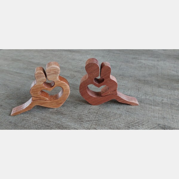 Een intiem moment tussen ouder en kind ‘gevangen’ in hout.